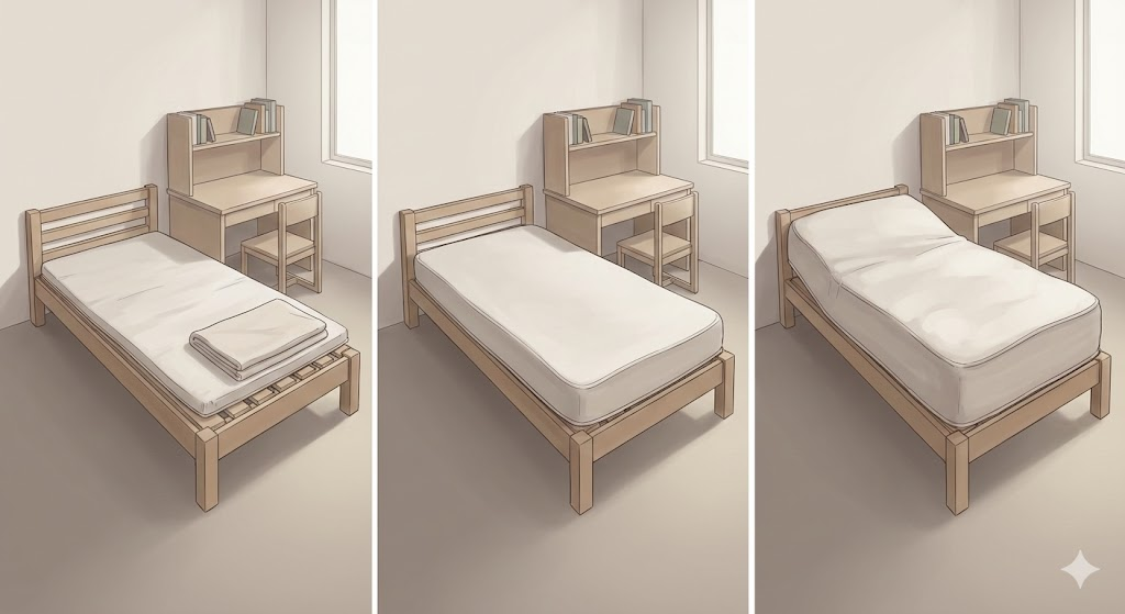 宿舍床墊厚度的關鍵不是越厚越好,而是依「床板硬度、搬動需求與原床墊狀況」選到剛剛好的厚度。